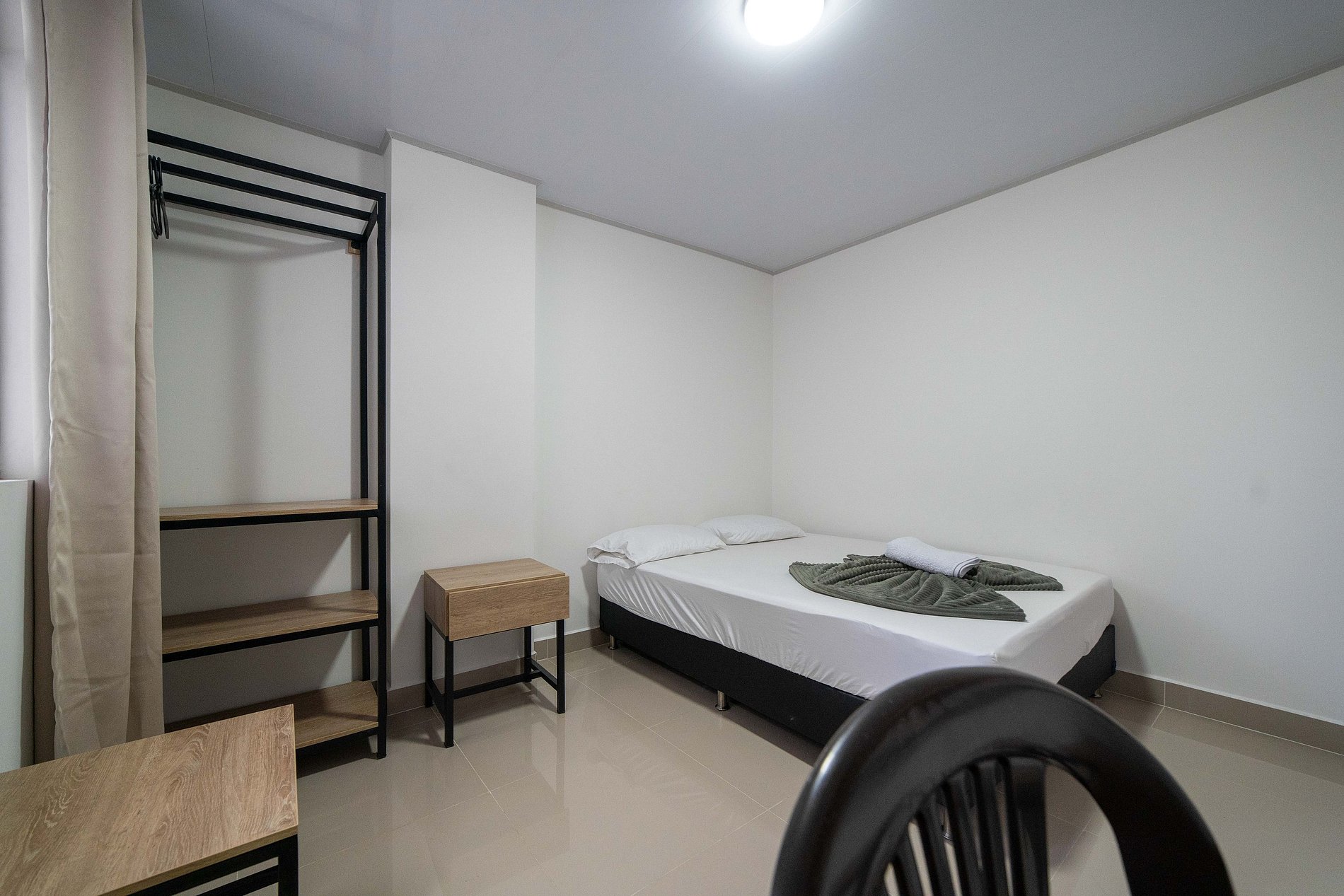 Este espacio es la perfecta combinación de simplicidad y confort. La cama doble, con su ropa de cama suave y limpia, invita al descanso, mientras que el ventilador de pared ofrece un toque retro que evoca la calidez de lugares tropicales. La decoración minimalista deja que el huésped personalice su experiencia, y la iluminación suave crea una atmósfera relajante, perfecta para desconectarse y sentirse en paz