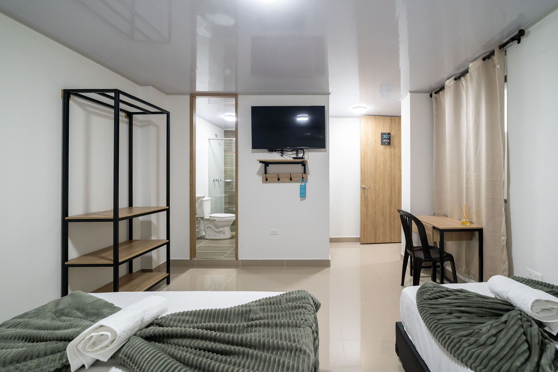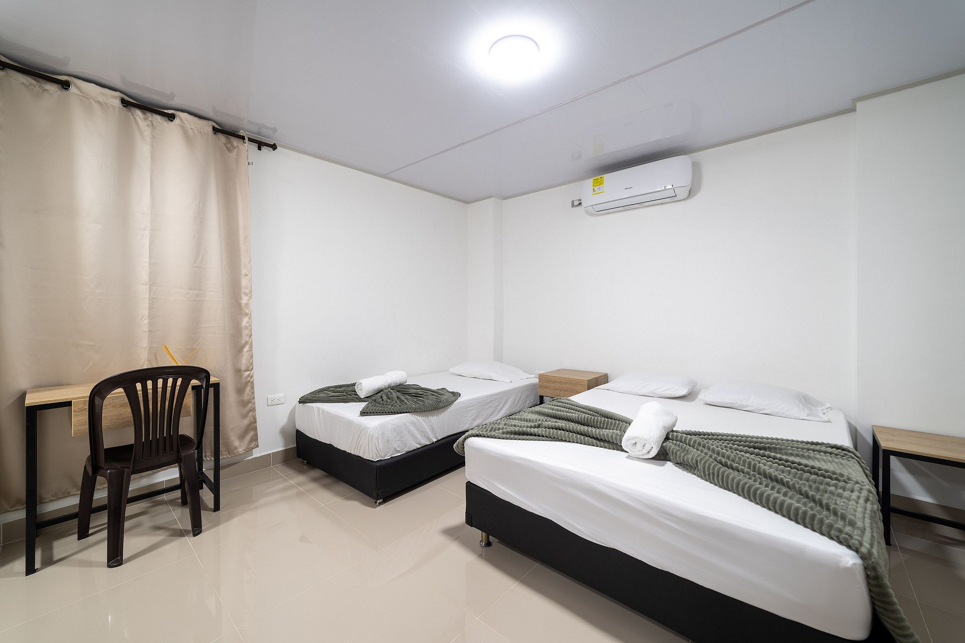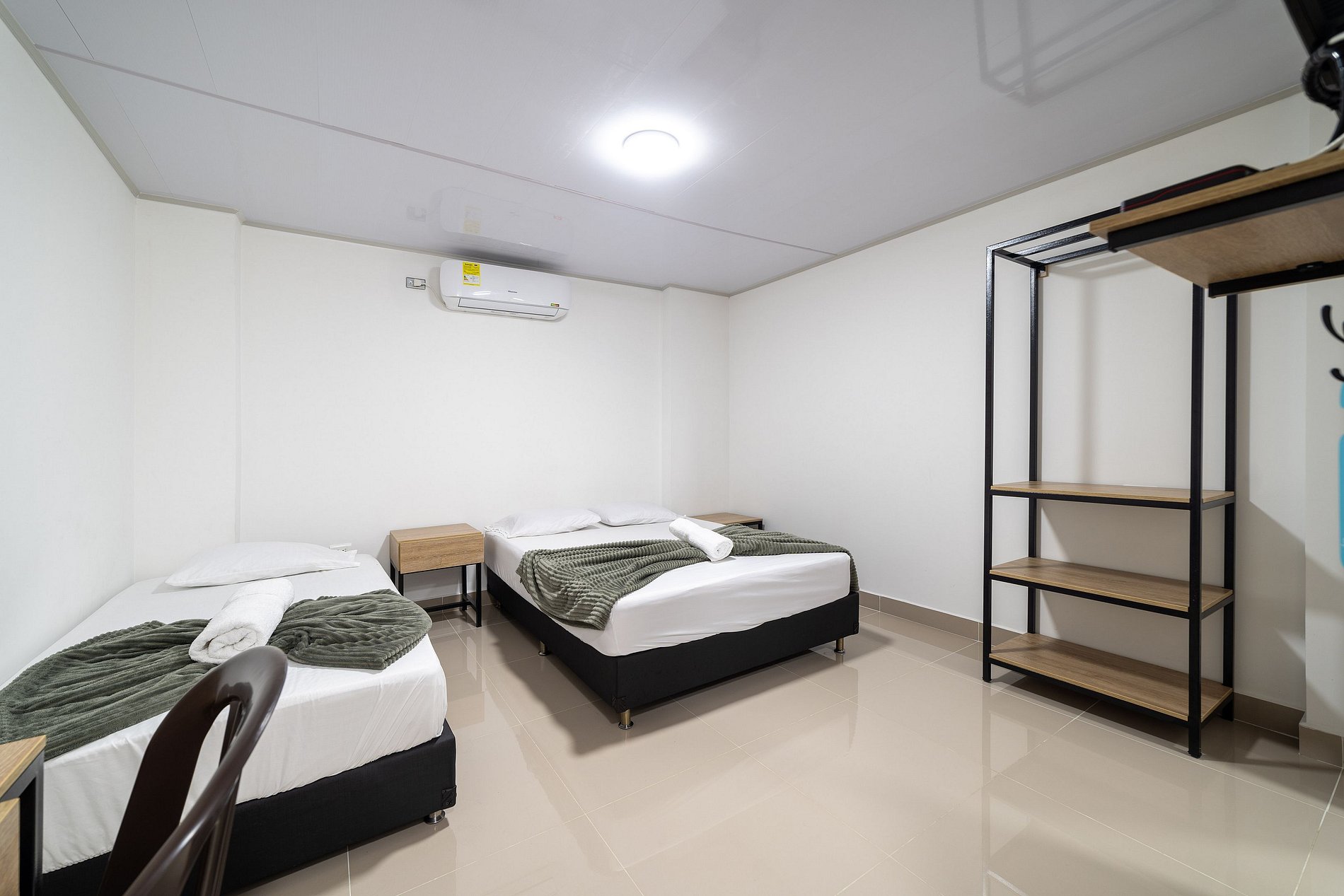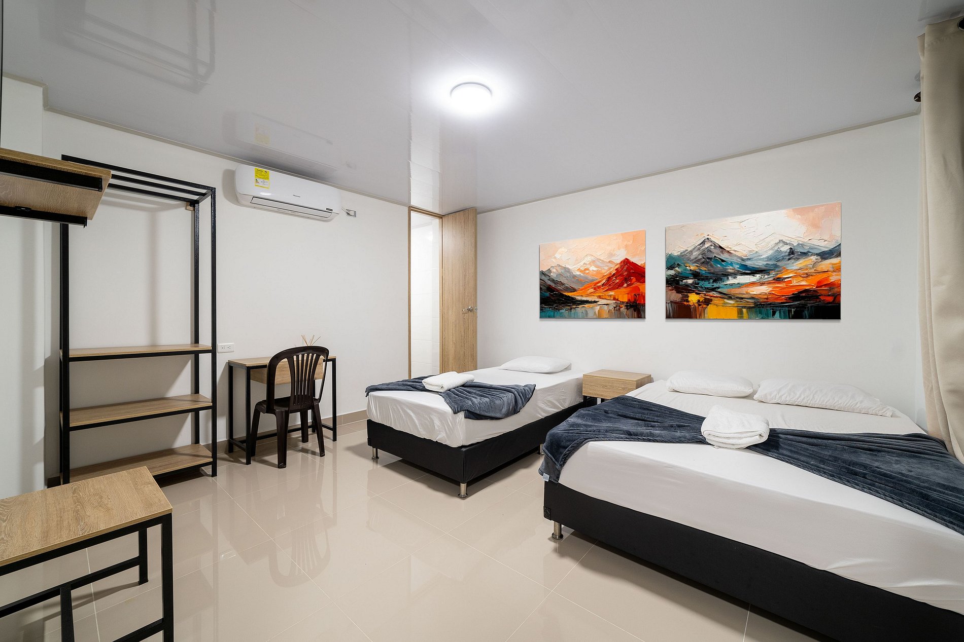 Este espacio es la perfecta combinación de simplicidad y confort. La cama doble, con su ropa de cama suave y limpia, invita al descanso, mientras que el ventilador de pared ofrece un toque retro que evoca la calidez de lugares tropicales. La decoración minimalista deja que el huésped personalice su experiencia, y la iluminación suave crea una atmósfera relajante, perfecta para desconectarse y sentirse en paz