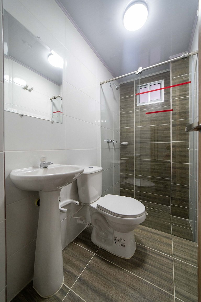 Este espacio es la perfecta combinación de simplicidad y confort. La cama doble, con su ropa de cama suave y limpia, invita al descanso, mientras que el ventilador de pared ofrece un toque retro que evoca la calidez de lugares tropicales. La decoración minimalista deja que el huésped personalice su experiencia, y la iluminación suave crea una atmósfera relajante, perfecta para desconectarse y sentirse en paz