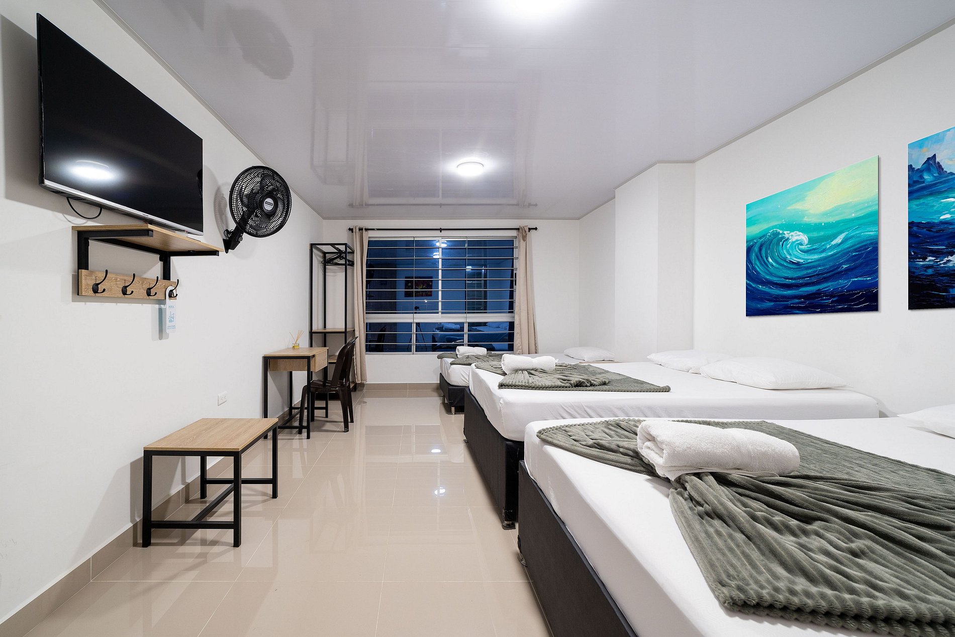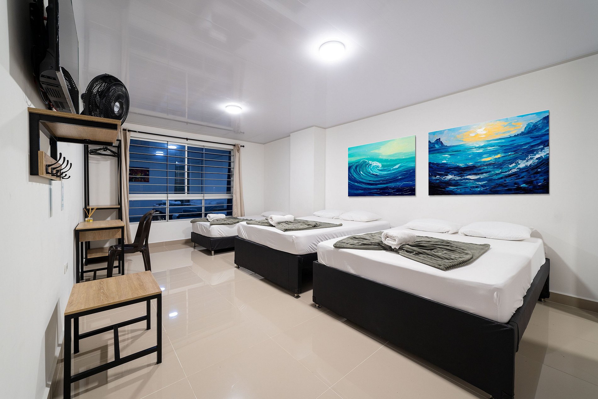 Este espacio es la perfecta combinación de simplicidad y confort. La cama doble, con su ropa de cama suave y limpia, invita al descanso, mientras que el ventilador de pared ofrece un toque retro que evoca la calidez de lugares tropicales. La decoración minimalista deja que el huésped personalice su experiencia, y la iluminación suave crea una atmósfera relajante, perfecta para desconectarse y sentirse en paz